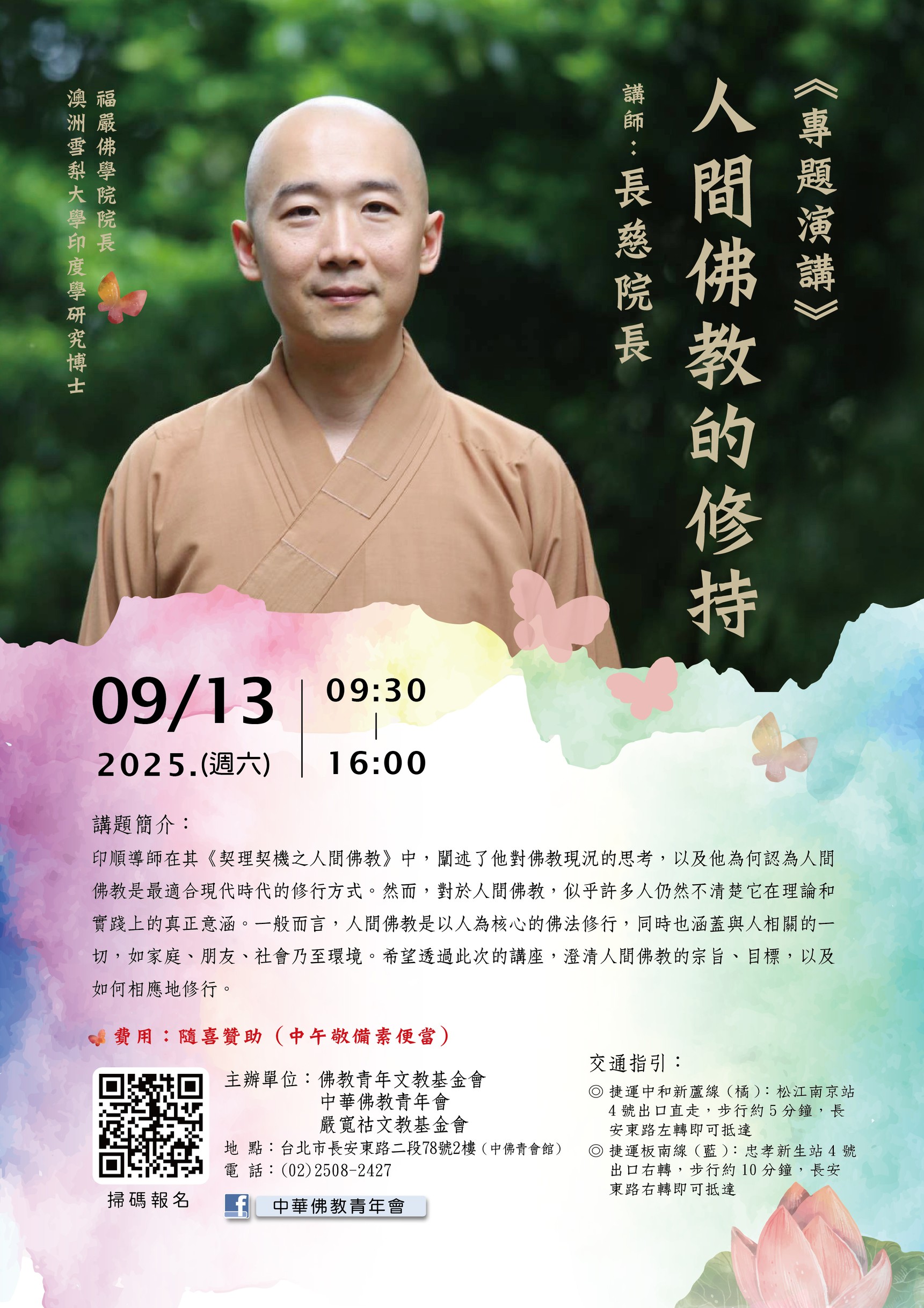 印順導師在其《契理契機之人間佛教》中,闡述了他對佛教現況的思考,以及他為何認為人間佛教是最適合現代時代的修行方式。然而,對於人間佛教,似乎許多人仍然不清楚它在理論和實踐上的真正意涵。一般而言,人間佛教是以人為核心的佛法修行,同時也涵蓋與人相關的一切,如家庭、朋友、社會乃至環境。希望透過此次的講座,澄清人間佛教的宗旨、目標,以及如何相應地修行。